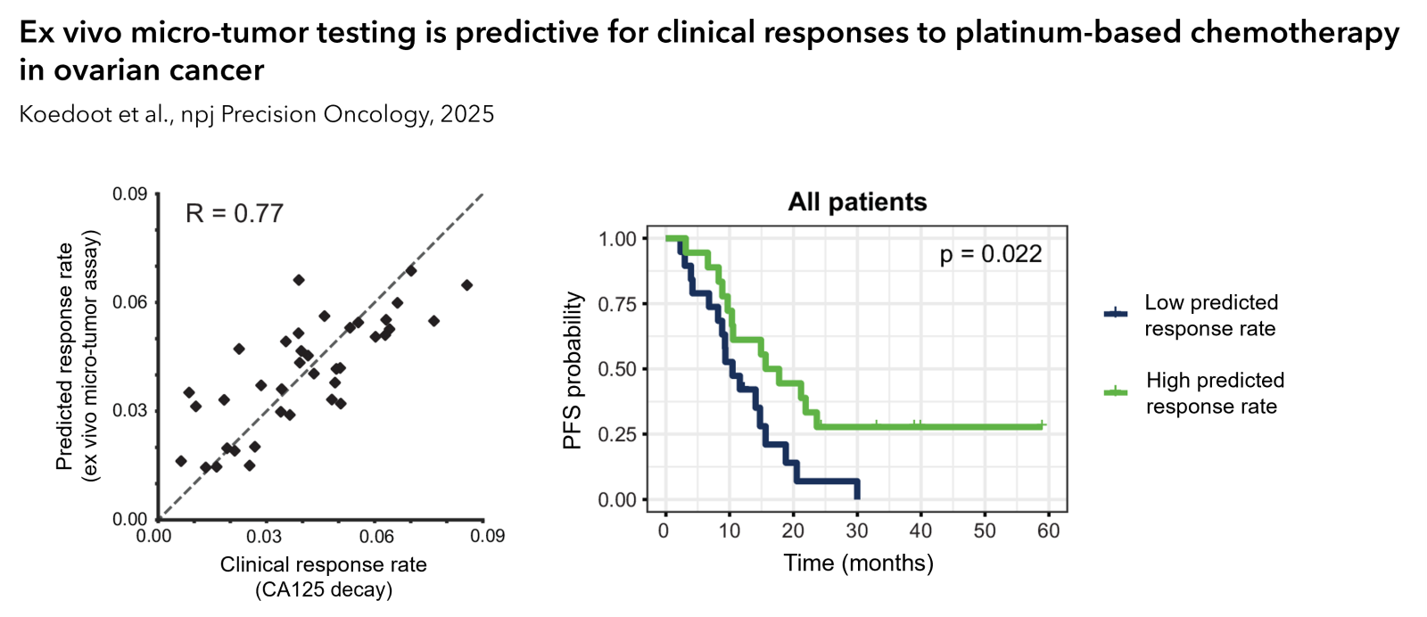 The ex vivo platform is proven predictive for clinical responses to platinum-based chemotherapy (Koedoot et al., npj Precision Oncology, 2025). In ovarian, lung and bladder cancer, clinical correlations have been established for chemo- and targeted therapies. Moreover, immunotherapy responses observed ex vivo correlate with clinical biomarkers such as PD-L1 expression.