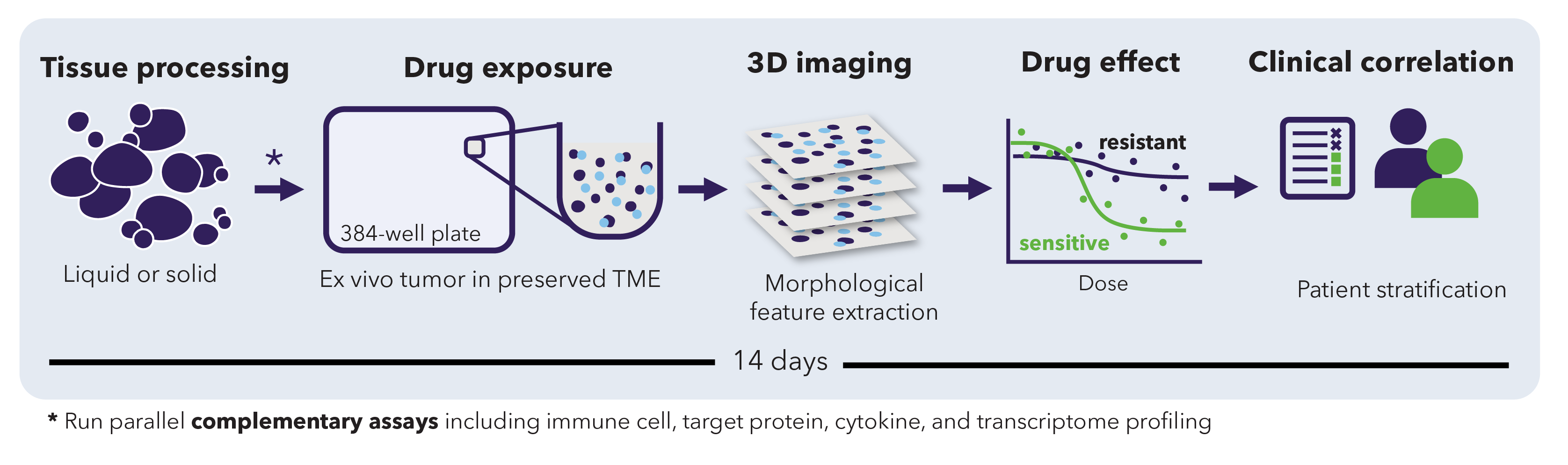 - Therapeutic modalities: The predictive algorithms generate precise read‑outs of how patients will respond to standard‑of‑care treatments. Simultaneously, the ex vivo efficacy for novel therapies such as antibody‑drug conjugates (ADCs), immune therapies like bispecific antibodies and combination regimens is assessed.
